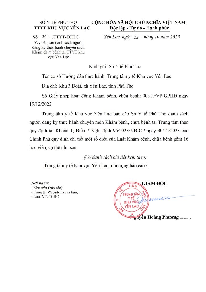 Đăng ký d/s người thực hành khám bệnh, chữa bệnh tại trung tâm y tế khu vực Yên Lạc
