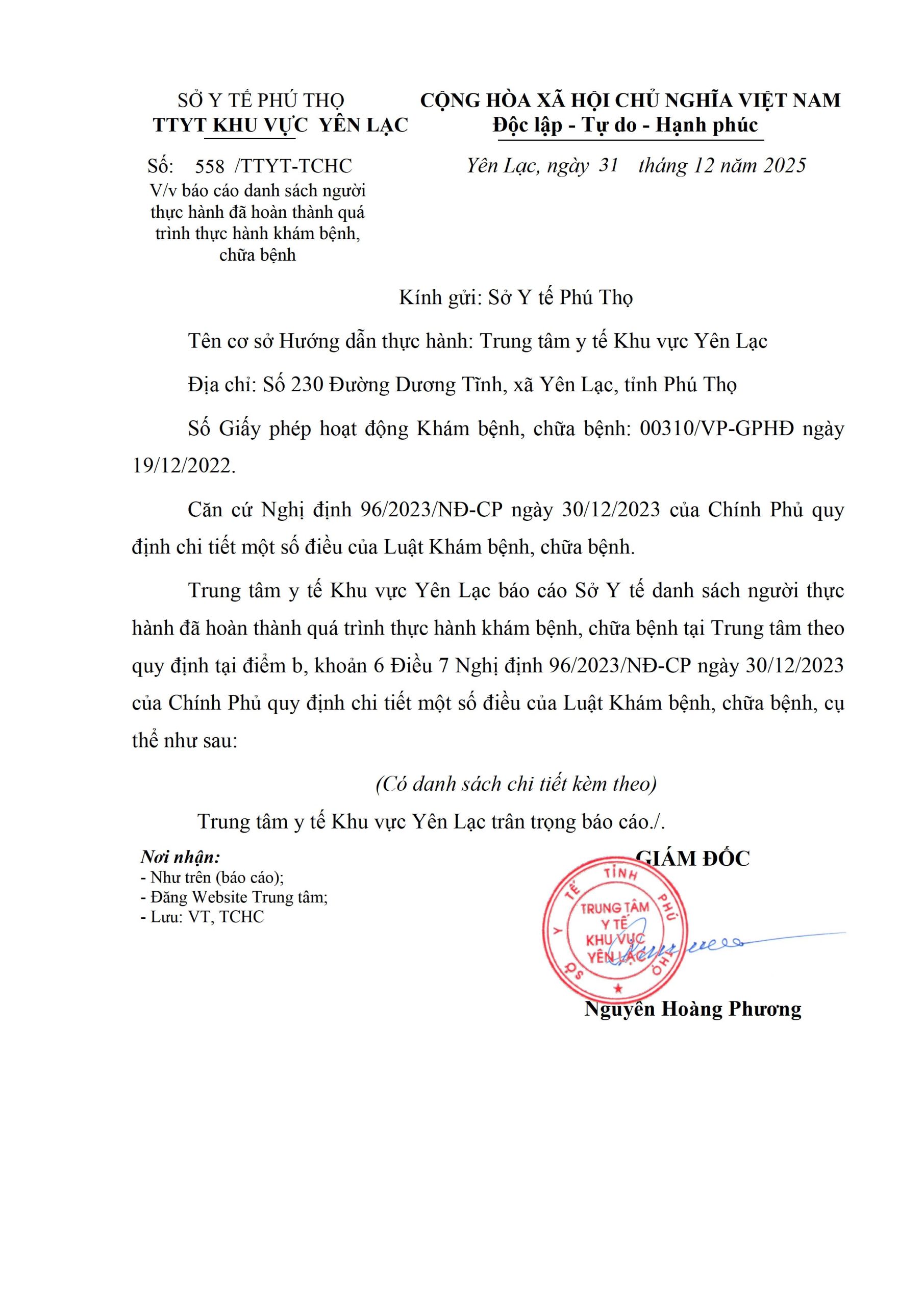 Báo cáo danh sách người đăng ký thực hành chuyên môn Khám chữa bệnh tại TTYT Huyện Yên Lạc